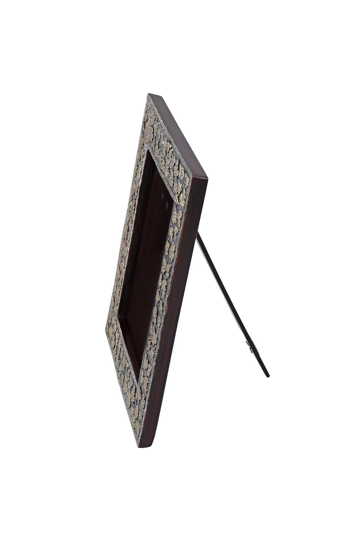 The frame features a beautiful composition of Leaves carved out of alloy with silver plating & oxidised finish on wooden base.