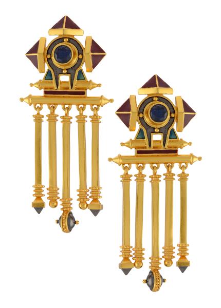The Nandi and Lord Shiva's Damru (drum) form enriching motifs for this dual tone plated alloy dangle earrings.