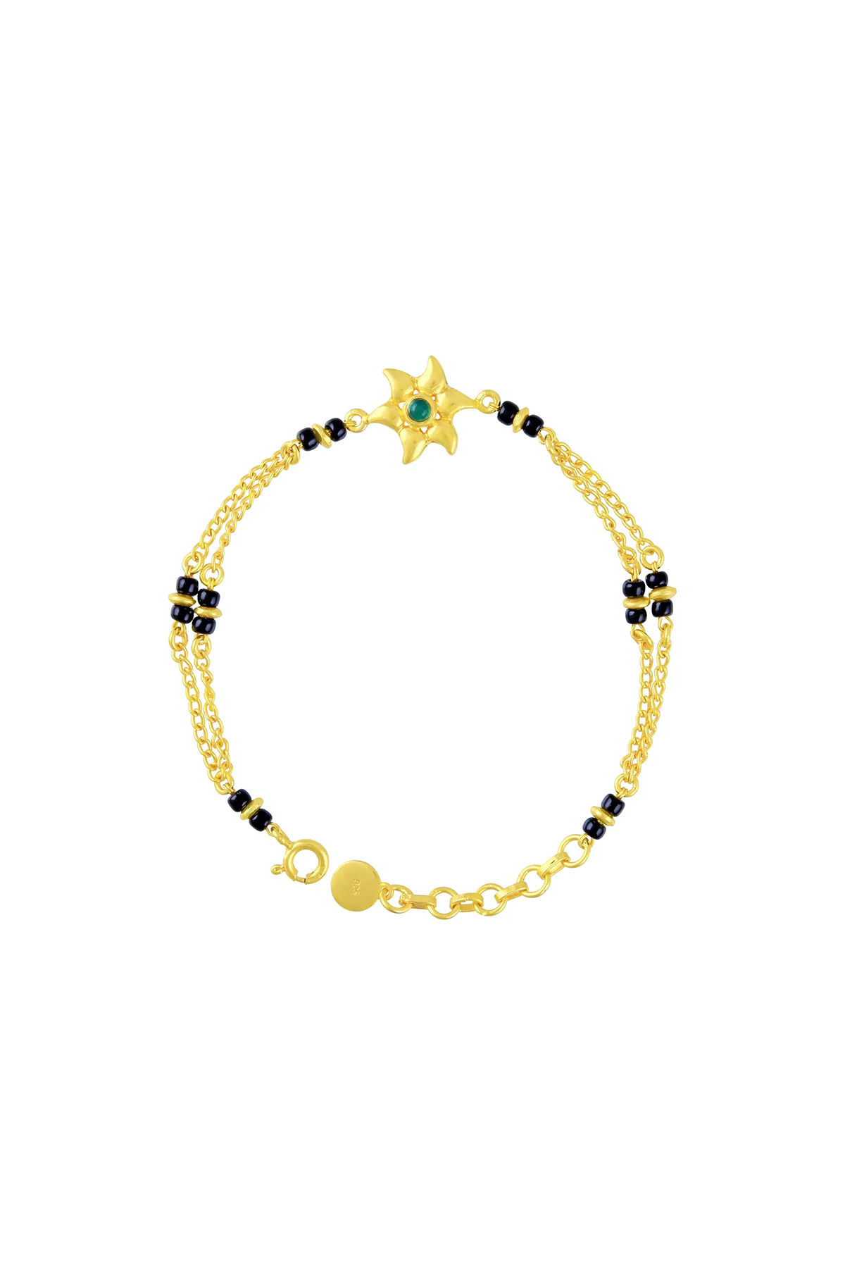 This gold plated silver mangalsutra features traditional motifs embellished with modern aesthetic by the use of pearls, zircons and enamel work.