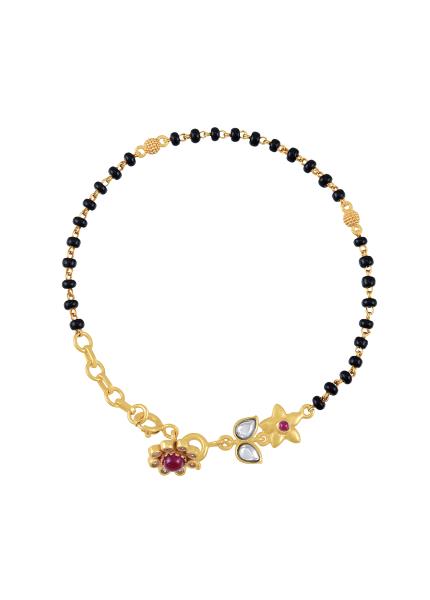 This gold plated silver mangalsutra features traditional motifs embellished with modern aesthetic by the use of pearls, zircons and enamel work.