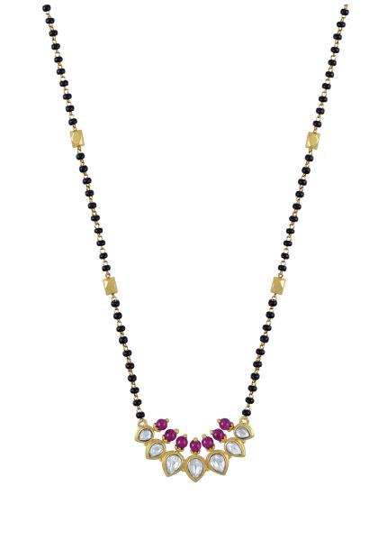 This gold plated silver mangalsutra features traditional motifs embellished with modern aesthetic by the use of pearls, zircons and enamel work.