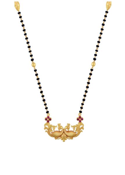 This gold plated silver mangalsutra features traditional motifs embellished with modern aesthetic by the use of pearls, zircons and enamel work.