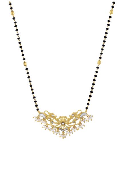 This gold plated silver mangalsutra features traditional motifs embellished with modern aesthetic by the use of pearls, zircons and enamel work.