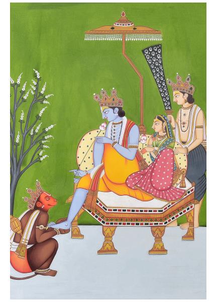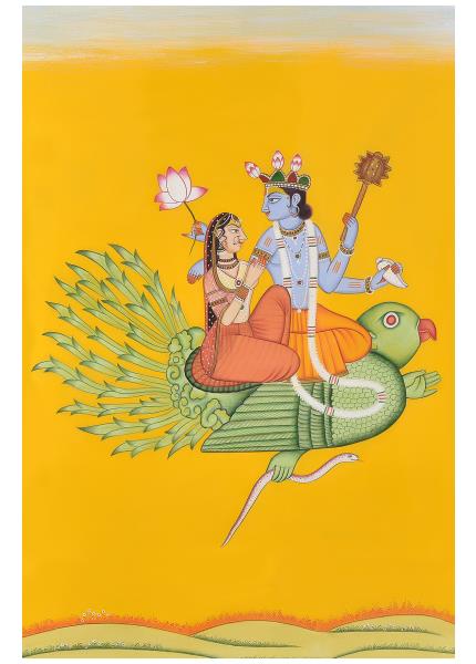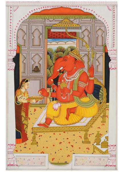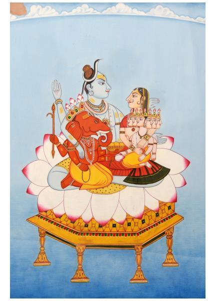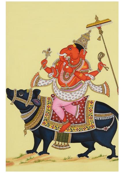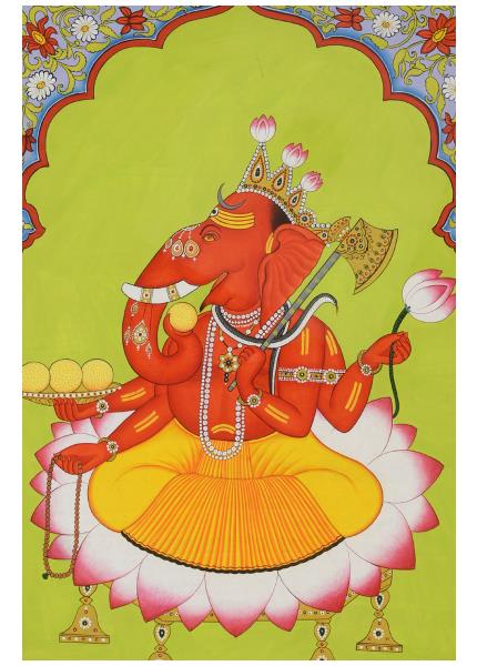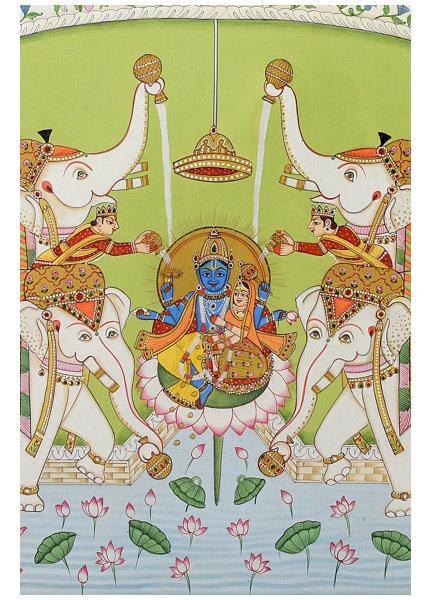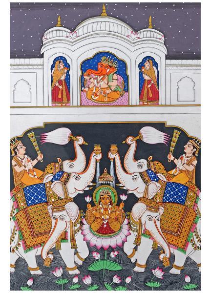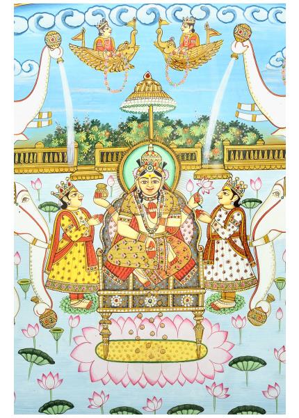 This beautiful miniature painting features the composition of Goddess Laxmi, Goddess Saravati & Lord ganesha along with elephants.