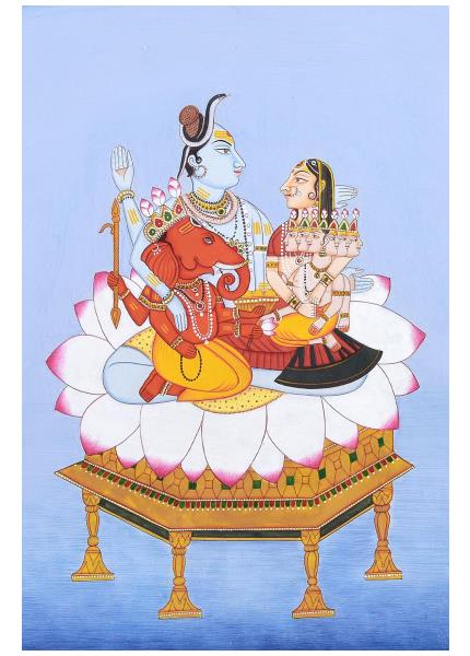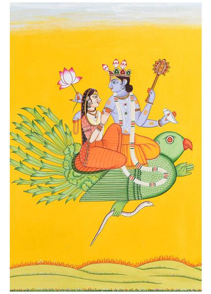 This handmade miniature painting features a beautiful composition of Laxminarayan along with Shubh-lubh.