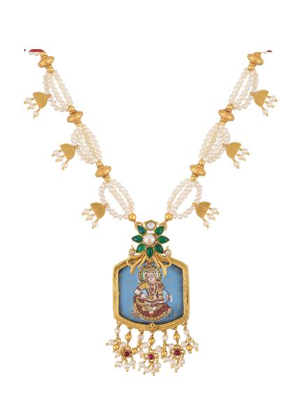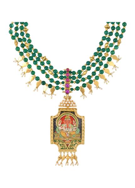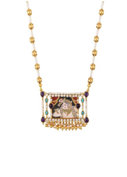 This exclusive gold-plated silver design is inspired by the classic paintings and temple architecture of the famed Thanjavur style of South India. The rich and vivid handmade figures of Hindu gods/goddesses/Religious iconography along with semi precious stones or crystals make this collection offbeat and awe-inspiring. Truly a timeless addition to your jewel box.
