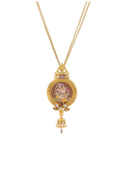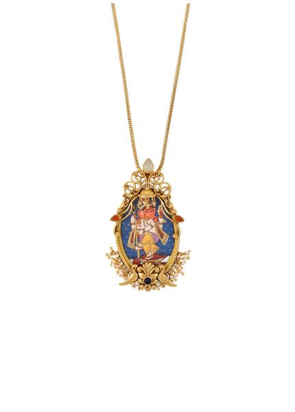 This exclusive gold-plated silver design is inspired by the classic paintings and temple architecture of the famed Thanjavur style of South India. The rich and vivid handmade figures of Hindu gods/goddesses/Religious iconography along with semi precious stones or crystals make this collection offbeat and awe-inspiring. Truly a timeless addition to your jewel box.