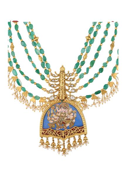 Lord Ganesha Thanjavur Painting Silver Floral Necklace