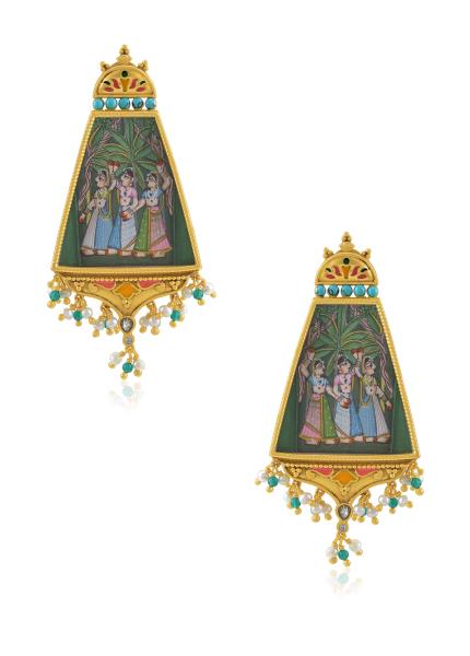 This exclusive gold-plated silver design is inspired by the classic paintings and temple architecture of the famed Thanjavur style of South India. The rich and vivid handmade figures of Hindu gods/goddesses/Religious iconography along with semi precious stones or crystals make this collection offbeat and awe-inspiring. Truly a timeless addition to your jewel box.