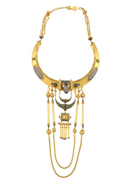 These multi textured necklace depicts Lord Shiva's persona with motifs like Shivling, bell and blue zircon which represent the past, present and future. This chain necklace is skillfully handcrafted in silver plated alloy, beautified with purple and red colored enamel.