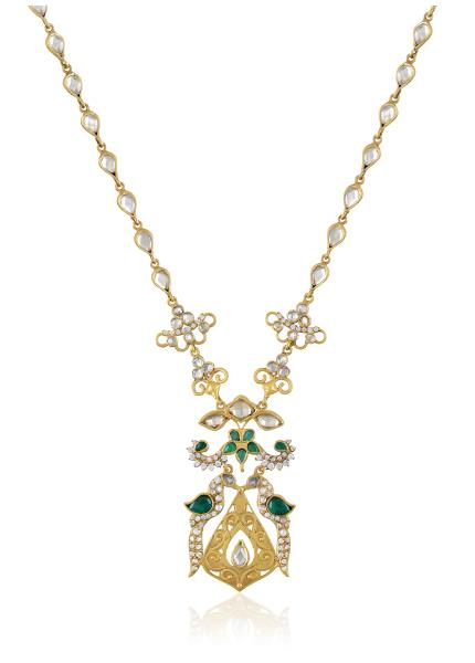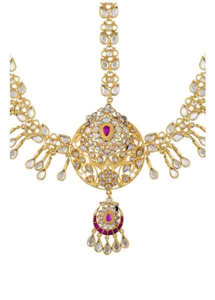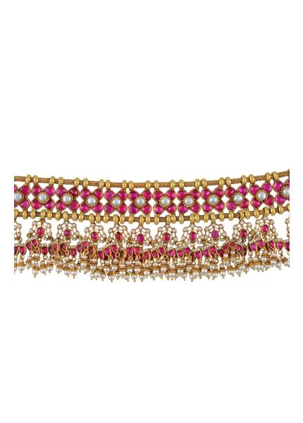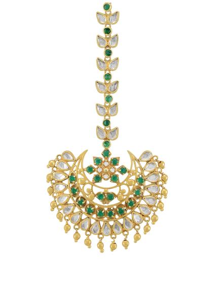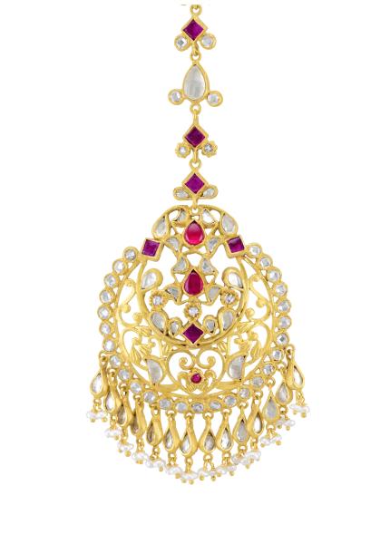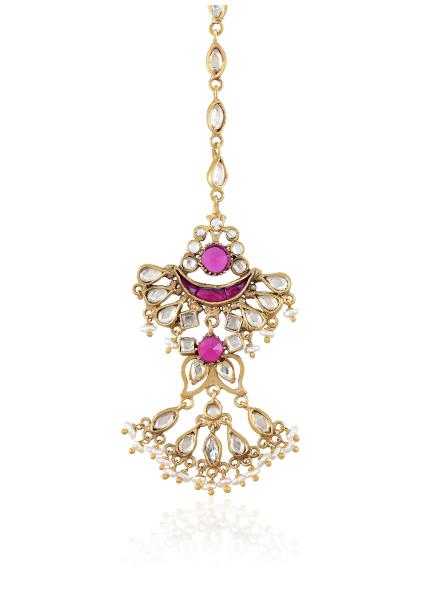 This maangtikka is exquisitely handcrafted out of silver with antique gold plating with vintage vibe, perfect for weddings and festivities. Intricately set with fine glass and pearls.