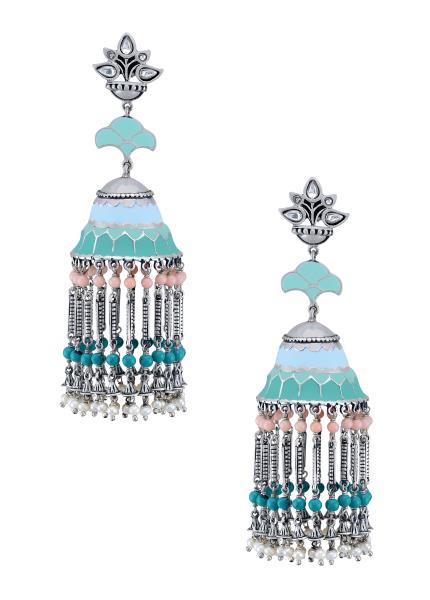 Meet our fab jhumki collection! Picture this - sweet pastel flowers in handcrafted silver, jazzed up with dangling colorful stones. But the magic touch is the dainty enamel work, adding that extra flair. These earrings? Total game-changers. Spice up your style with this fancy floral vibe, because who needs ordinary?!