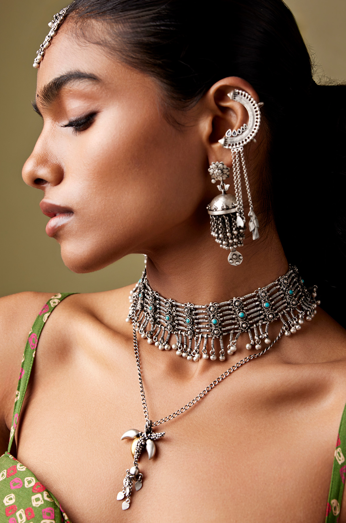 For a bold and beautiful style statement, get hold of these silver tribal earrings with rawa, ghungroo and filigree work.