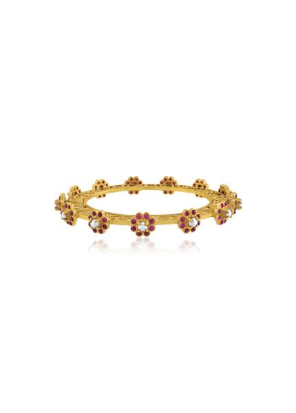 Adorned with pearl and pink glass, this bud embellishment ring made in gold plated silver is a adorable ornament to your fingers