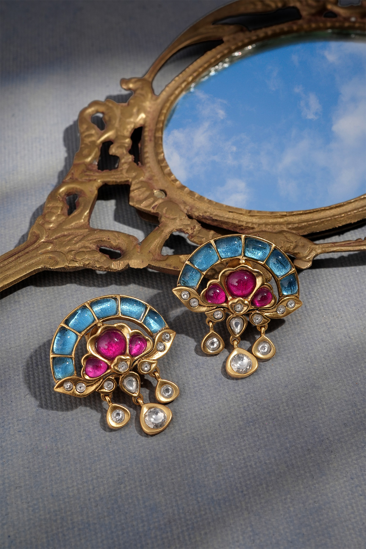 These sophisticated lotus and pear drop ear studs are handcrafted in gold plated silver with coloured glass. These are perfect for weddings, celebrations and special occasions.