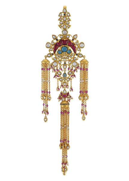 This traditional lotus lotus bangle is handcrafted in gold plated silver, stuuded with multi colored glass and pearls