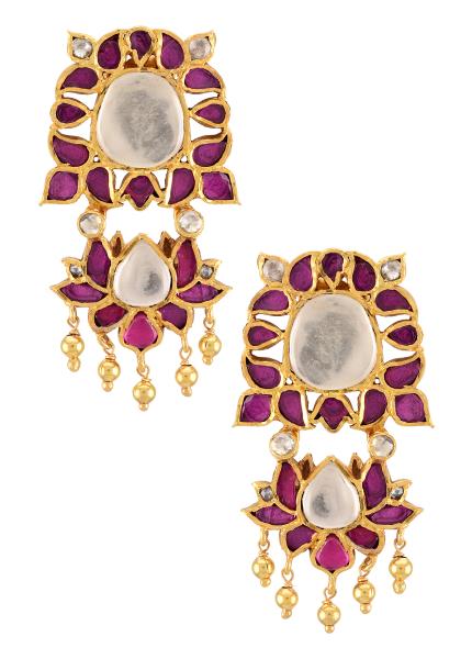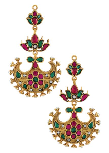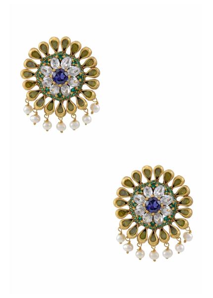 These ear studs are handcrafed in silver with gold plating and features a beautiful composition of floral embellishments, sadorned with glass and pearls droplets.