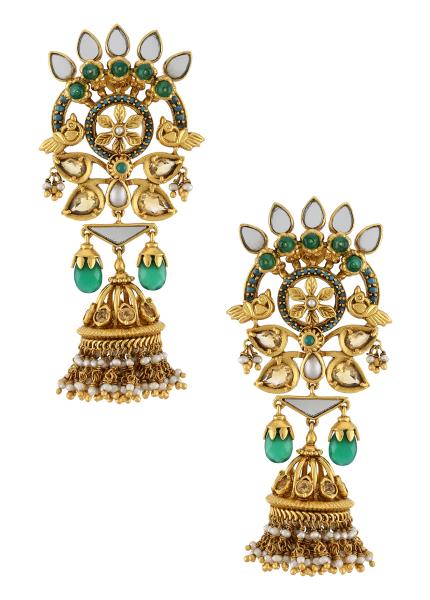 Shine brightest with traditional jewellery inspired by the joyfulness of sunflowers, and replete with traditional floral motifs. These earrings are handcrafted in gold plated silver with glass, pearls, mirrors and citrine stones.