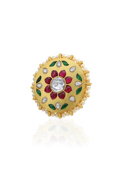 Pear shaped embellishment ring handcrafted in gold plated silver, studded with pink and white glass and lined with pearls