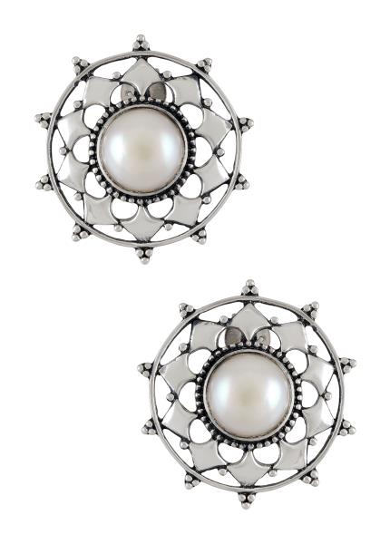 These ear studs are handcrafted in silver with antique gold finish, studded with colourful glass and features a beautiful composition of Lotus and 3D Kalash motifs.