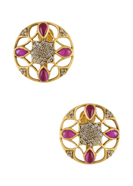 A tribute to the Maratha’s grandeur, this style showcases timeless ethnic style and traditional craftsmanship of a bygone era. This floral maangtikka is handcrafted in gold plated silver, studded with pink glass and pearls.