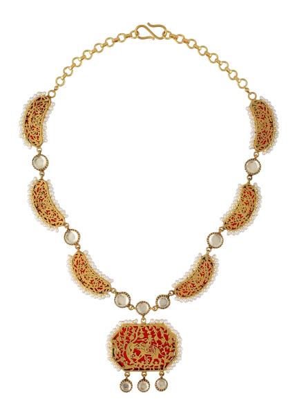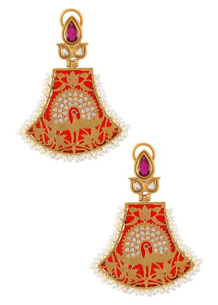 Intricately handcrafted and beautifully sprinkled with elaborate designs, These earrings exude a unique vintage charm. This jewellery has stunning crystal, pearl and glass work showcasing traditional peacock and floral motifs carved out of silver and plated with an antique gold finish. Perfect for all your festive and special celebrations.