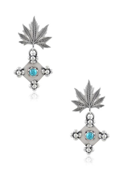 Beautiful silver oxidized rawa triangle mirror blue enamel jhumka with dazzling silver bead droplets.