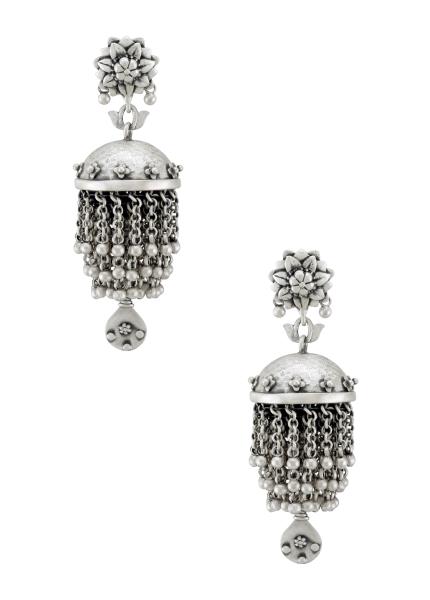 For a bold and beautiful style statement, get hold of these silver tribal earrings with rawa, ghungroo and filigree work.