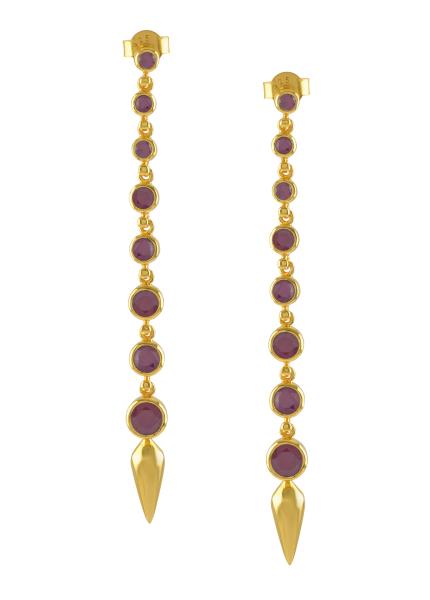 Trillion motif front back earrings made in silver and adorned with dyed ruby stones.