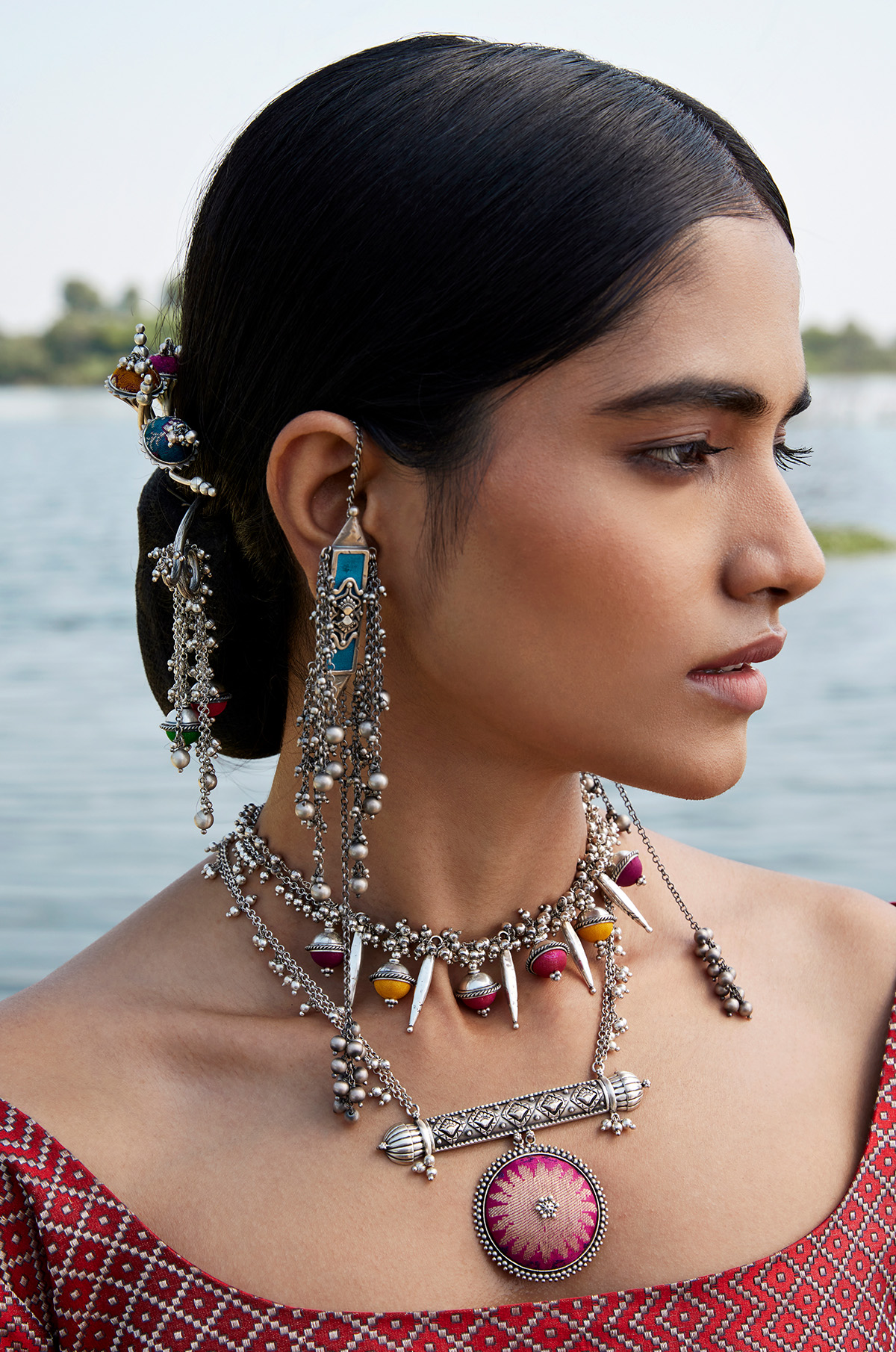 Composition: Silver with banarasi fabric. All our jewellery is handmade therefore slight variations may occur. Disclaimer: Placement of fabric/motif may vary in each product.