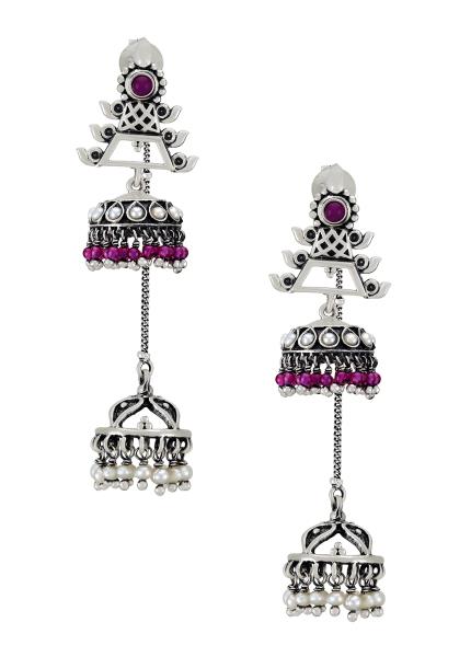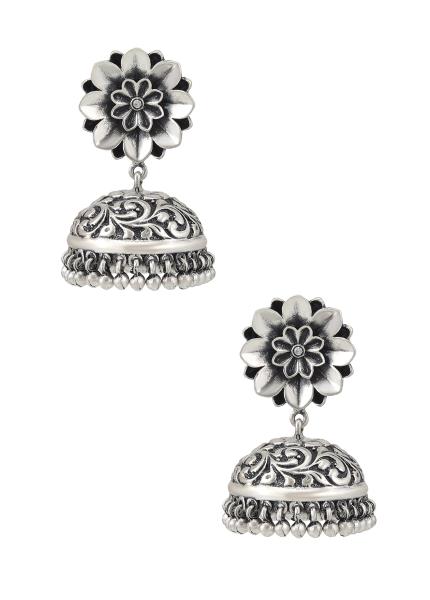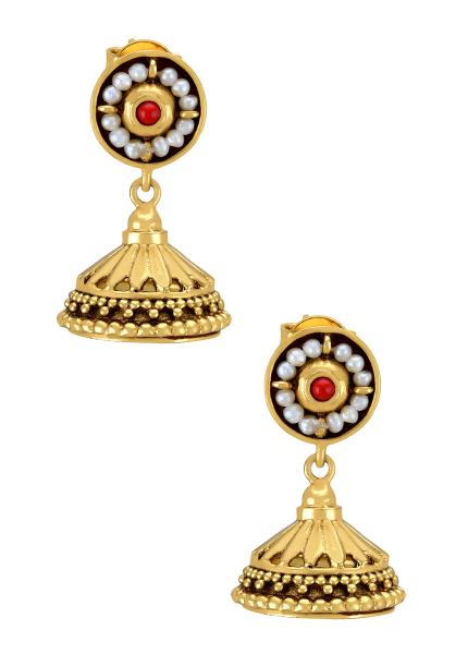 The versatile traditional jhumkis in this range will beautifully complement your attires for all special occasions. This design is handcrafted in gold plated silver set with stones.