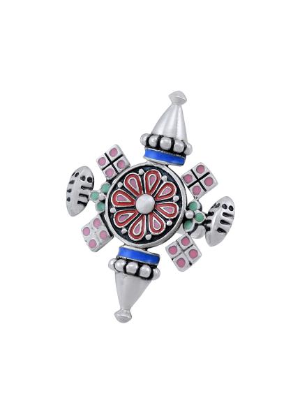 The Chandrika collection beautifully intertwines contemporary fashion with the resonance of signature Amrapali craftsmanship and tradition. Mythical creatures of ancient India form the embellishment of this silver plated alloy ring adorned with pastel pink enamel.