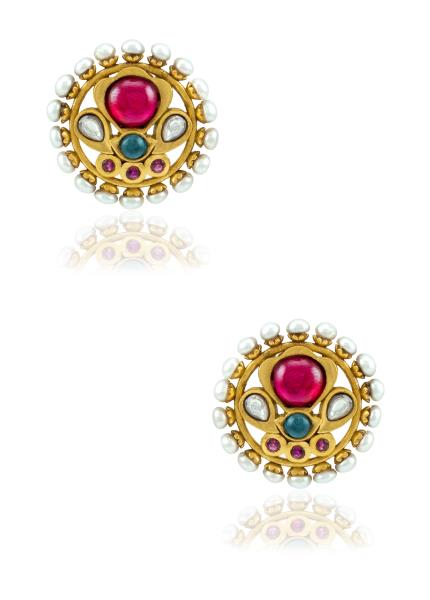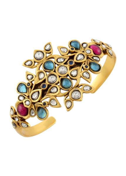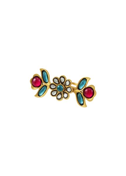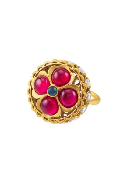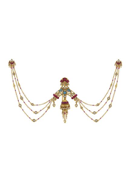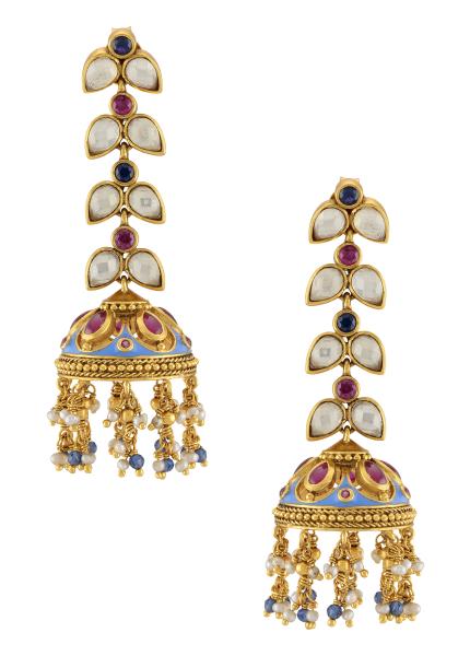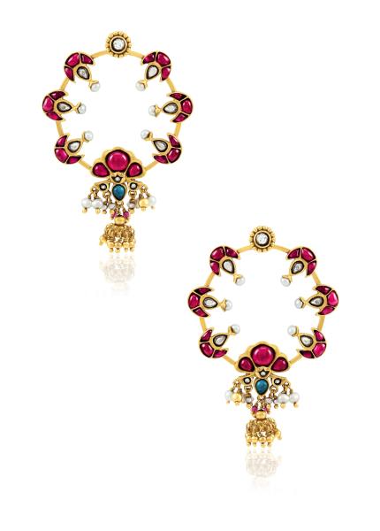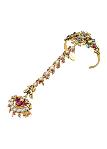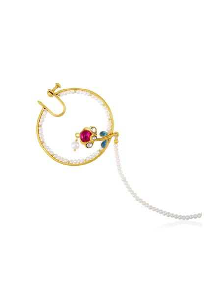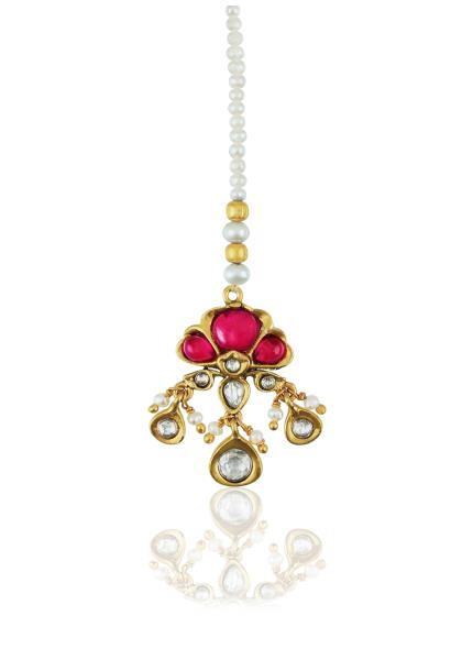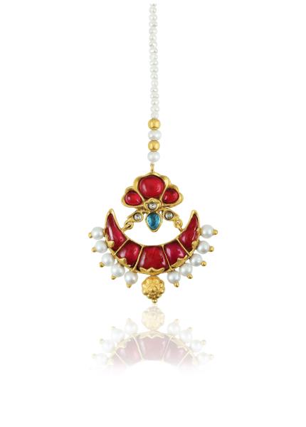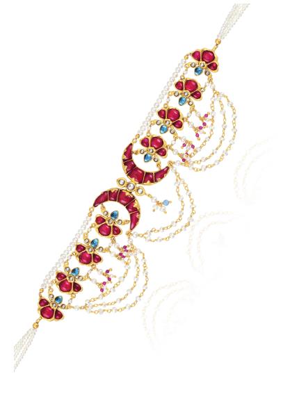 This lotus motif pendant necklace is handcrafted in gold plated silver with coloured glass and a beaded chain. This style is perfect for weddings, celebrations and special occasions.