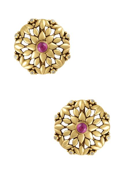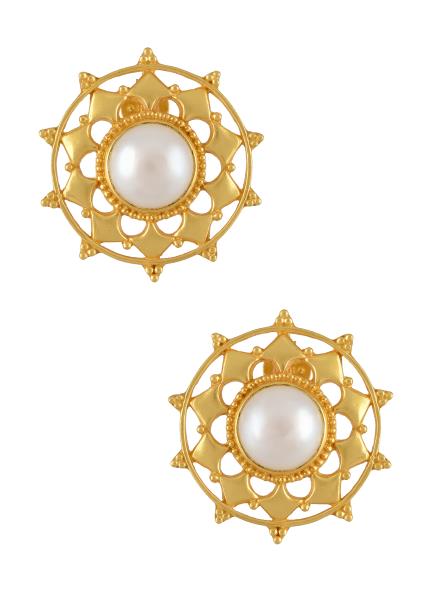 A sophisticated gold plated silver round ear studs embellished with an embossed Mayura motif and lined with rounded domes