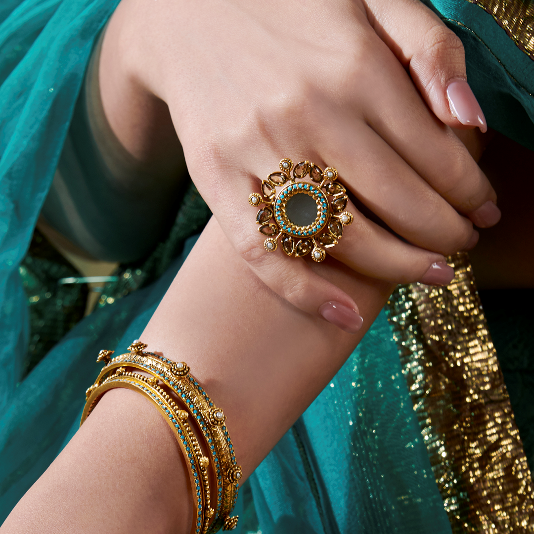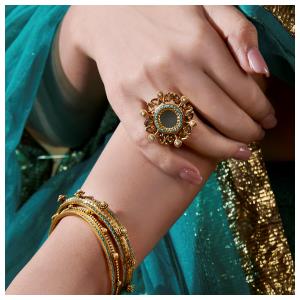 Bringing together time-honoured Indian artistry and a modern sensibility, the Kimaya Collection features handcrafted, gold-plated silver jewels beautifully adorned with intricate pearls and glass stones.
